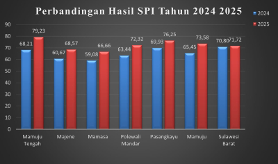 Namun, setahun berselang, SPI 2025 menghadirkan peta integritas yang berbeda. Sulbar secara keseluruhan naik menjadi 71,72%, dengan lonjakan paling mencolok di Mamuju Tengah yang melesat ke 79,23% dan masuk zona terjaga. Pasangkayu (76,25%) dan Mamuju (73,58%) berhasil keluar dari kategori rentan menuju waspada. Polewali Mandar pun naik ke 72,32%, meski tetap bertahan di zona rentan. Majene (68,57%) dan Mamasa (66,66%) masih tertinggal, memperlihatkan jurang ketimpangan yang belum tertutup.